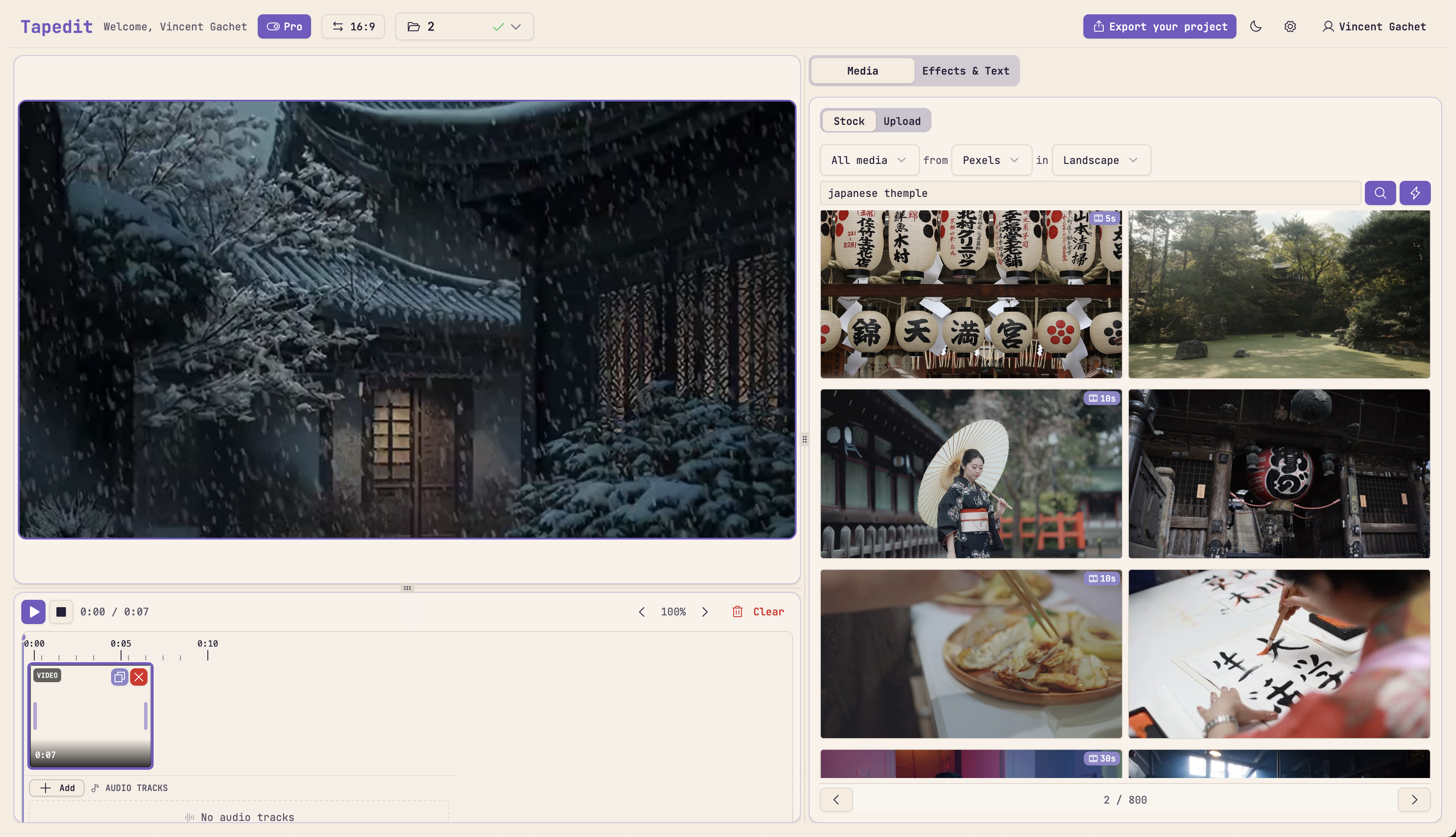 Search Pexels and Pixabay directly from the editor. Royalty-free videos and photos ready for commercial use on any platform.