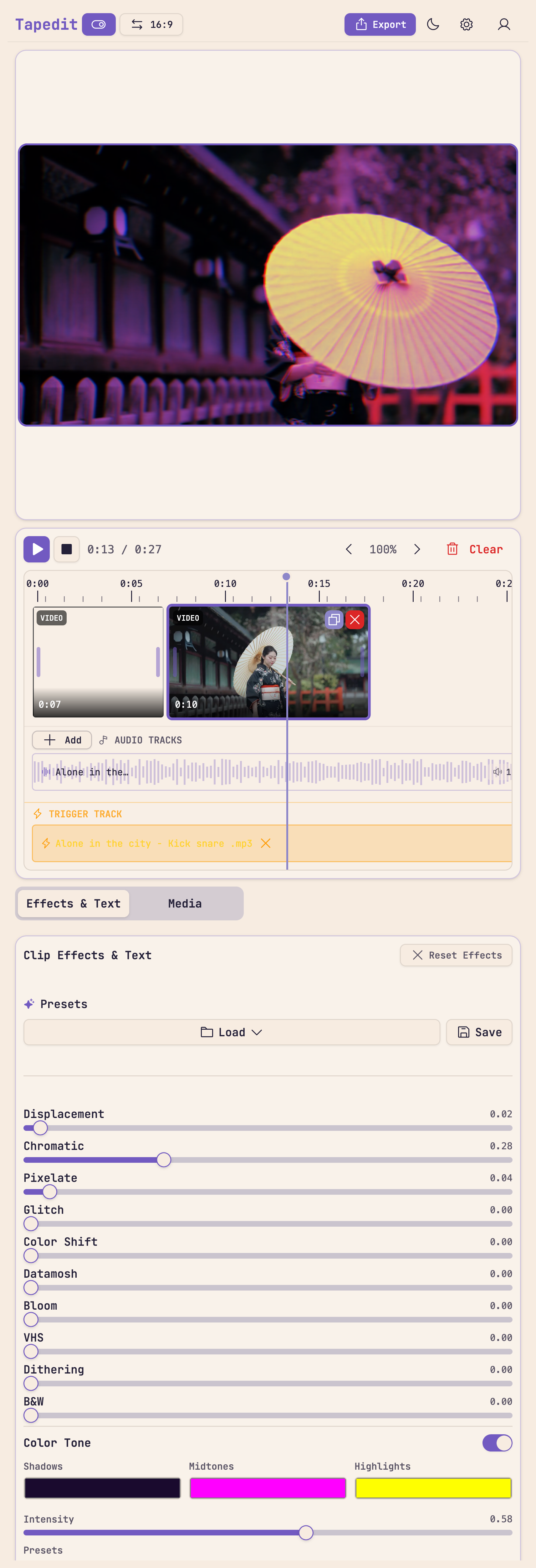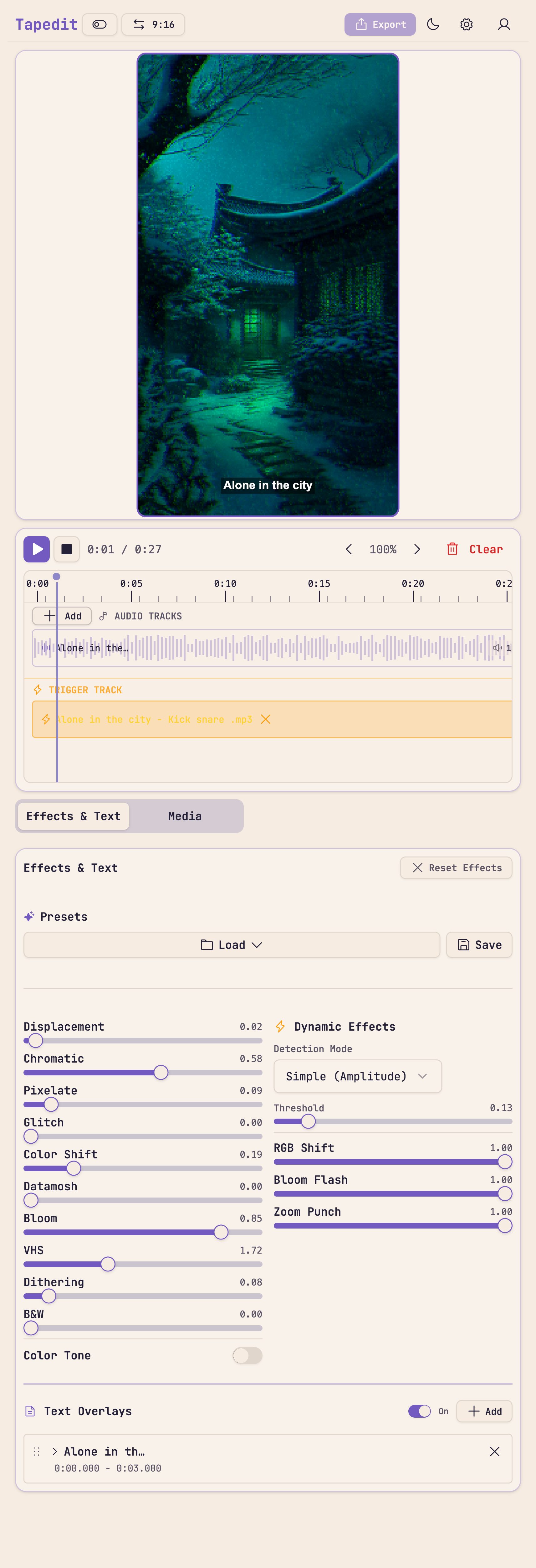 VHS, glitch, chromatic aberration, grain, dithering, pixelate, neon glow, displacement, datamosh, vintage color tones, and more. All effects are fully customizable and audio-reactive.